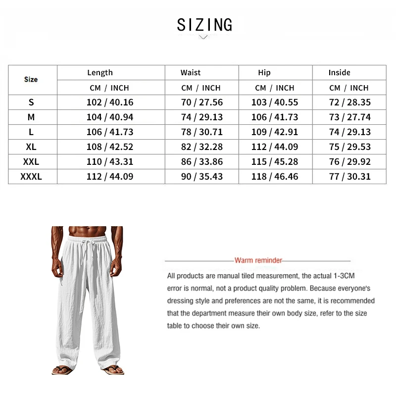 With a modern fit tailored for streetwear and fitness enthusiasts alike, these pants combine functionality and fashion. Whether you're heading to the gym, a casual outing, or simply relaxing at home, these breathable linen trousers provide effortless style and comfort. Pair them with your favorite sneakers or loafers for a sharp, contemporary look.